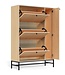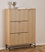 Moderne schoenenkast in eikenlook met lamellenfront en zwart stalen onderstel. Met 3 klep-lades berg..
