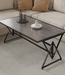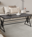Deze stijlvolle rechthoekige tafel combineert een verfijnd donkergrijs marmerlook tafelblad met een opvallend geometrisch zwart roestvrij metalen frame, wat zorgt voor een exclusieve uitstraling in elke moderne woonkamer of eetruimte.
